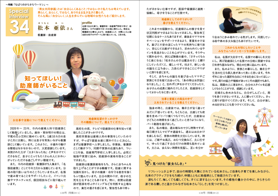 今号の「なばりのきらきらウーマン」は、助産師として市内で活動している松本亜依さんにインタビューしています。それに関連する形で、名張市で受けられる「お産まわり」のサポートについて紹介しています。