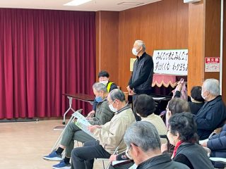2月18日(日)10時より大会議室で「高齢者交通安全教室」を開催。多くの参加を頂き講師に赤目駐在所田中警部補・お巡りさんに、クイズ形式で解りやすく解説して頂きました。「車の停止距離、ダイヤマーク、交通ルール等非常に和やかに和気あいあいと過ごせ、来てよかった。良い勉強になった」など参加者の声。