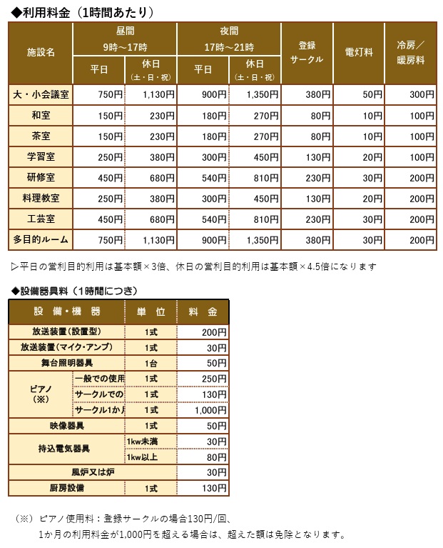 - 申請受理後でも、市や県等主催の公的行事開催や市民センター主催事業などにより、お断りする場合もありますのであらかじめご了承ください。