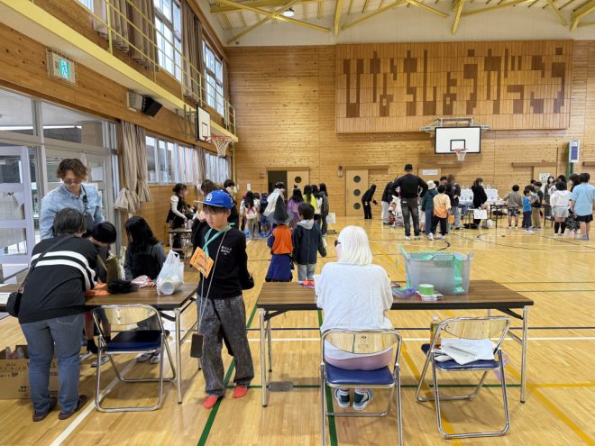 あいにくの空模様のため比奈知小学校体育館で行われた友遊まつりには、OB/OGボランティアのみなさんはじめ約150人の参加者が来場し、昔遊びやしっぽ取りイベントなどで賑わいました。