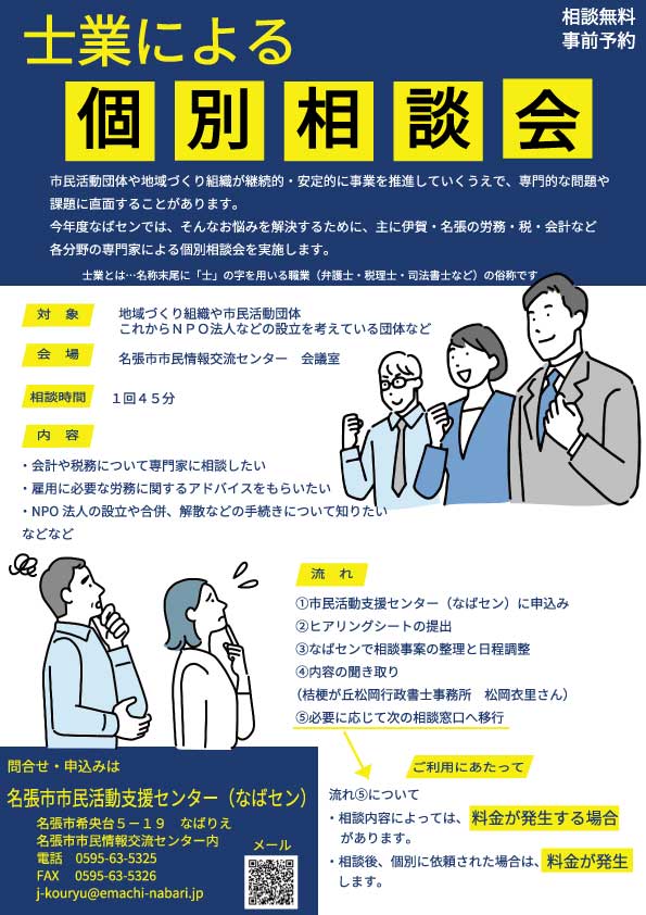 そんな悩みを解決するために、伊賀地域の労務・税・会計などの各分野の専門家による個別相談会を実施します。