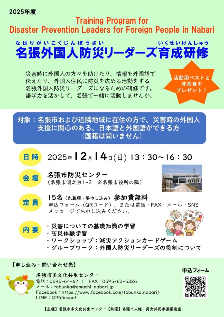 名張市多文化共生センター(NabiChan)は、「名張(なばり)外国人(がいこくじん)防災(ぼうさい)リーダーズ育成(いくせい)研修(けんしゅう)」を開催(かいさい)します。