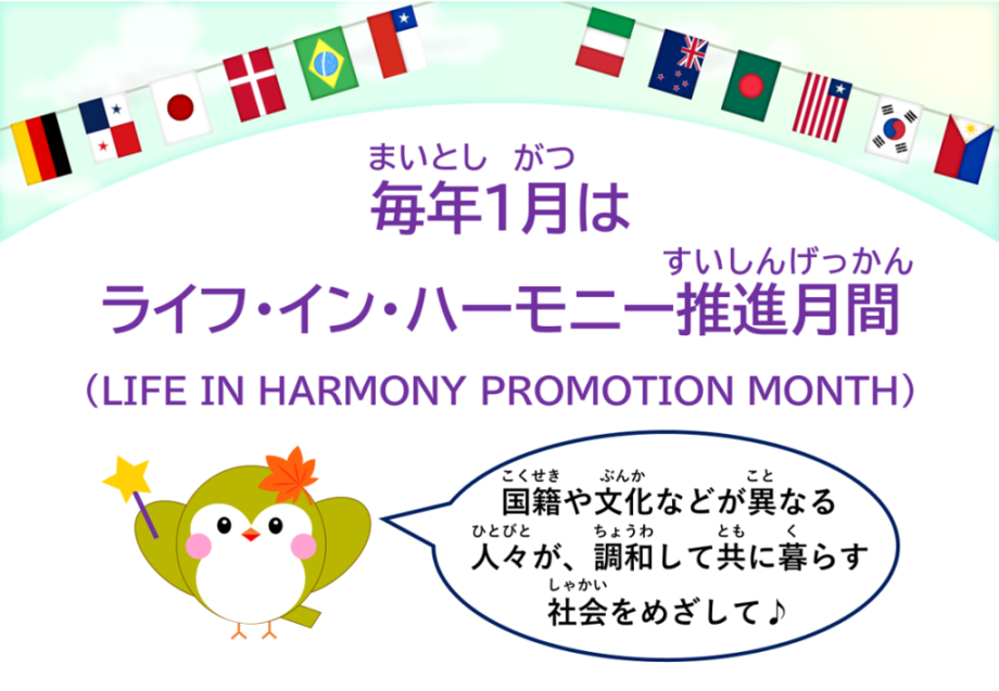 法務省(ほうむしょう)と出入国在留管理庁(しゅつにゅうこくざいりゅうかんりちょう)は、外国人(がいこくじん)との共生社会(きょうせいしゃかい)の実現(じつげん)をめざして啓発(けいはつ)する月間(げっかん)として、2024年(ねん)から毎年(まいとし)1月(がつ)を「ライフ・イン・ハーモニー推進月間」と定めました。