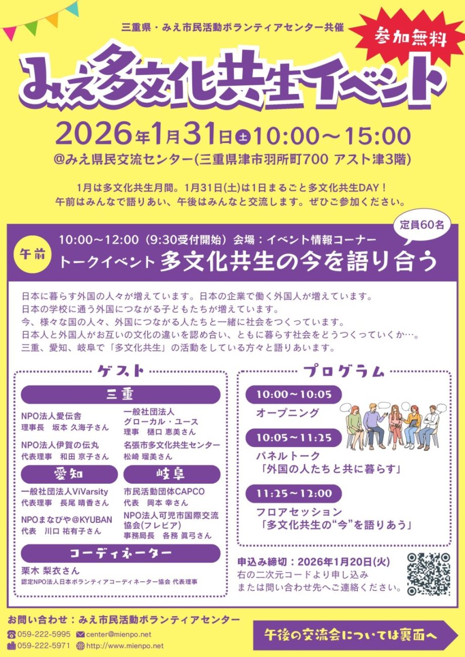 三重県(みえけん)と、みえ市民活動(しみんかつどう)ボランティアセンターは、三重県多文化共生月間(みえけんたぶんかきょうせいげっかん)のイベント「みえ多文化共生(たぶんかきょうせい)イベント」を開催(かいさい)します。