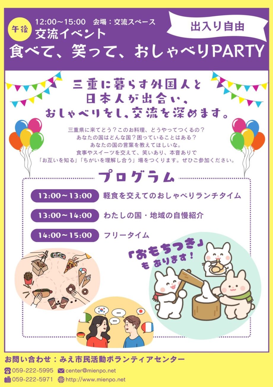 ・12:00~15:00 交流(こうりゅう)イベント「食(た)べて、笑(わら)って、おしゃべりPARTY」