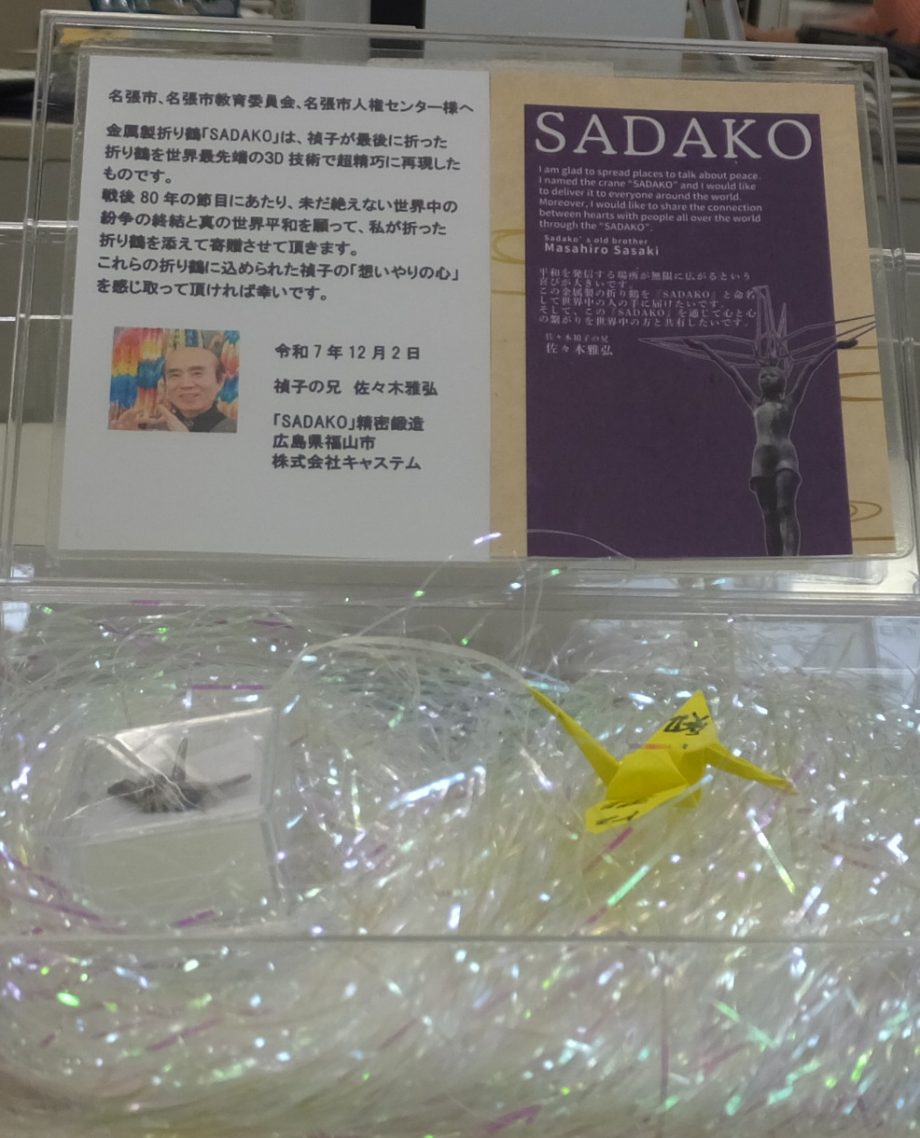 2025年12月7日(日)に開催いたしました「第77回人権週間記念行事 ふれ愛コンサート」にご出演いだだきました、佐々木雅弘さんより、相手を「思いやる」ことや相手と「分かちあう」心を共有できるように、佐々木禎子さんの遺品の折り鶴のレプリカを贈呈していただきました。名張市人権センターにおいて展示させていただきました。貴重な贈り物をご覧ください。