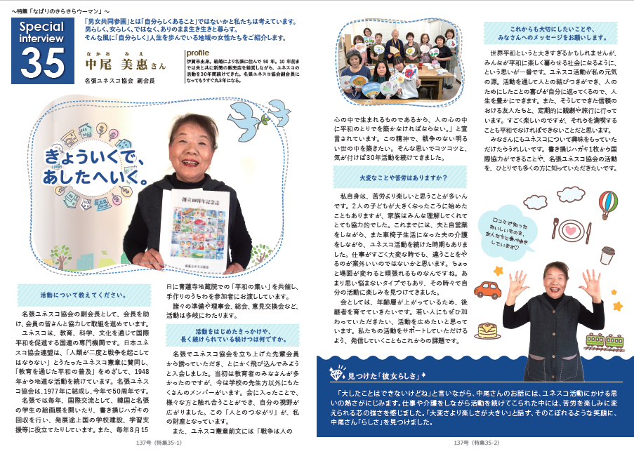 「なばりのきらきらウーマン」は、名張ユネスコ協会副会長として活動している中尾美惠さんにインタビューしました。
