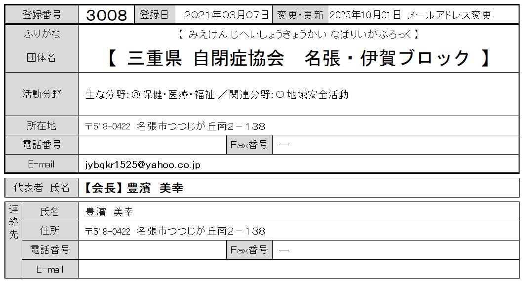 三重県そして名張・伊賀地域の自閉症児・者の権利と幸福のため、治療・教育・福祉・労働の対策の充実を図るような運動を展開する事を目的としています。