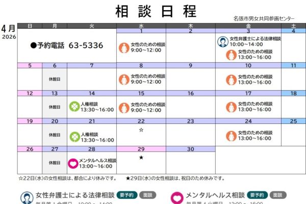 写真は2026年4月の相談予定です。ひとりで悩まず、お気軽にお申し込みください。予約受付電話:0595-63-5336(月曜日休館、9時〜17時) #男女共同参画 #名張市男女共同参画センター #男女共同参画つうしん # […]