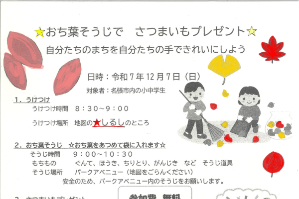自分たちのまちを自分たちの手できれいにしよう ー>>>>>さつまいもプレゼント!! 日 時:令和7年12月7日(日) 受付8:30~ 対象者:名張市内の小中学生 お問い合わせ:hinataboccco0214@gmail […]