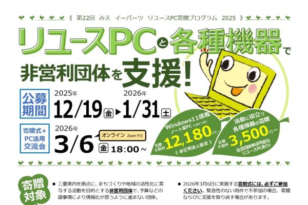 三重のリユースPC寄贈プログラムは今回で22回目を迎えます。個人のPCでは団体活動とのデータの棲み分けも大変ですよね。NPOの皆さんは、この機会に団体専用PCの導入を検討してみてはいかがでしょうか?また、PC以外にも活動 […]