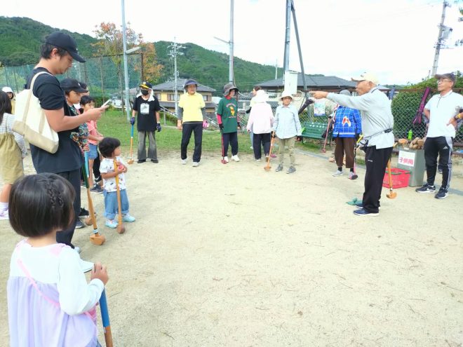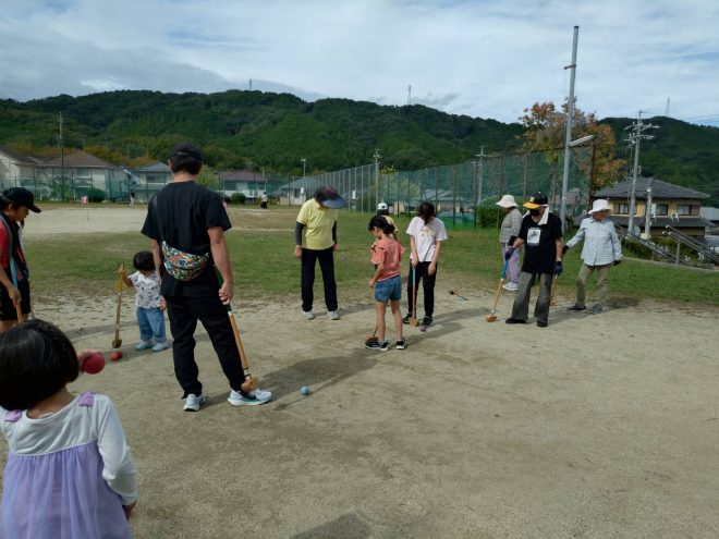 10月11日(土)、わいわい子ども広場では「グランドゴルフを楽しもう」を開催しました。梅が丘の老人会である瑞長会の皆さんにご協力いただき、打ち方のコツを教わりながら、子どもたちは9ホールに挑戦!雨も心配される中でしたが、ホールインワンが出ると歓声が上がり、笑顔いっぱいのひとときに。初めての子も、何度も挑戦する子も、みんなで楽しくグランドゴルフを楽しみました。