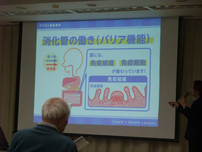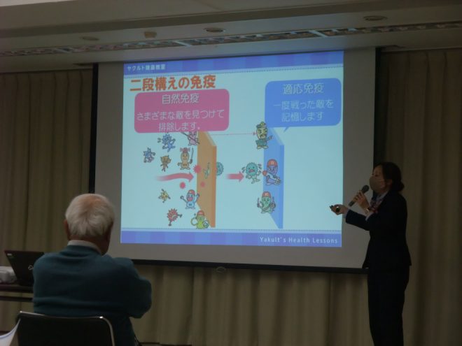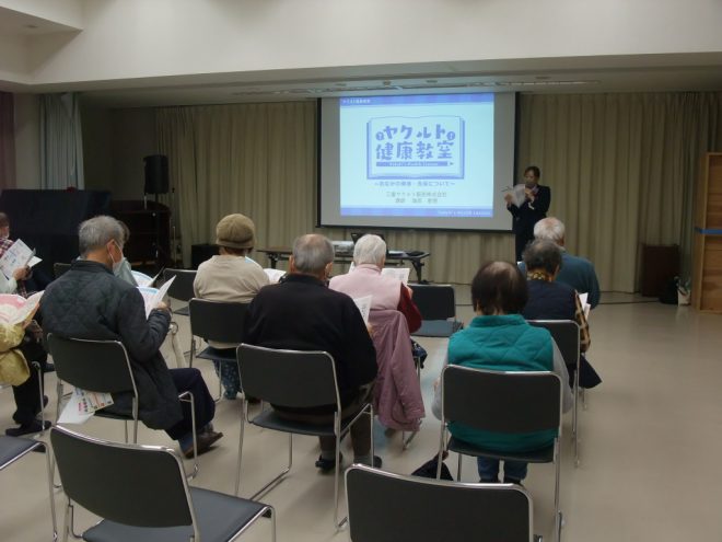 12月3日、高齢者学級にて、ヤクルトの講師をお招きし「おなかの健康と感染症対策について」の講演会を開催しました。講演では、感染症予防の基本や免疫力を高める生活習慣、そして腸内環境を整えることの大切さについて学びました。