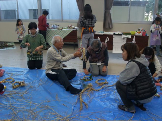 12月9日(土)わいわい子ども広場では、年末恒例になったしめ縄飾りをつくろうを開催しました。濡らして柔らかくしたわらをねじって巻いていきます。子どもたちは苦戦しながらも、地域の皆さんにお手伝い頂きながら、作っていきました。飾りもつけて、華やかなしめ縄飾りができました。