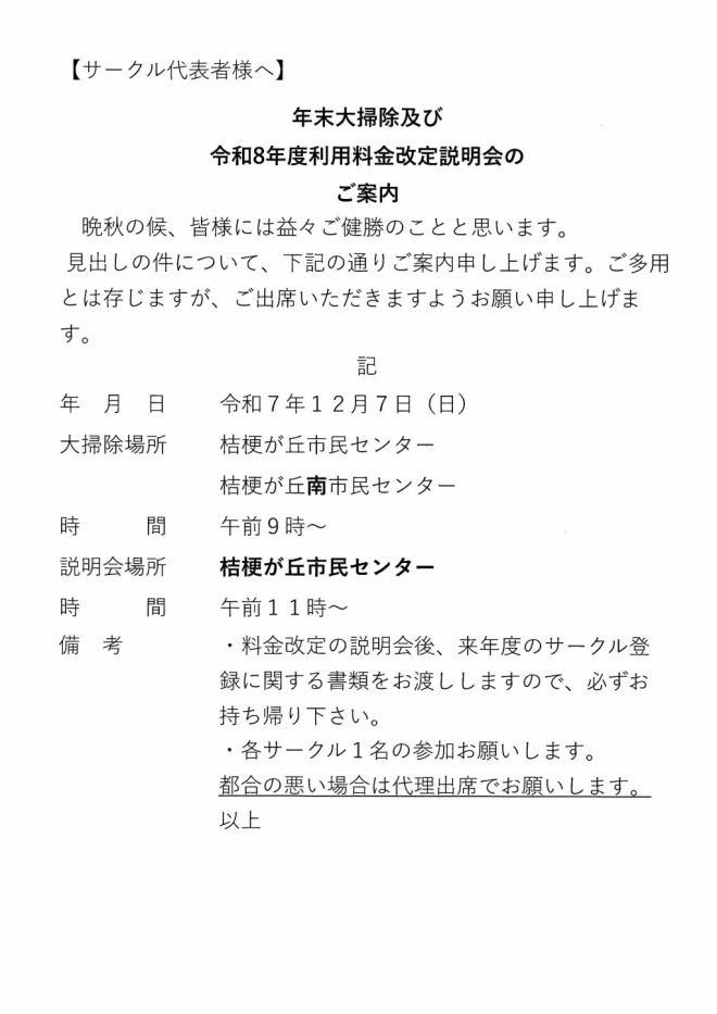 令和8年度利用料金の説明会及び年末大掃除のご案内