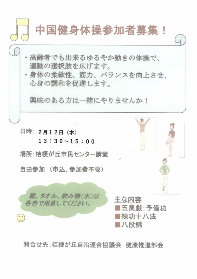 2月12日木曜日は、 今年度の中国健身体操の最終日です。 皆さんご参加ください。