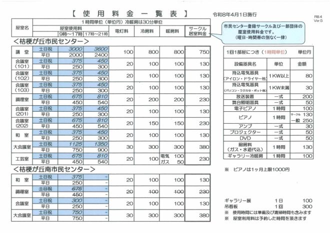 使用料金一覧表を改定しました
