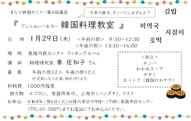 韓国料理(キンパ・わかめスープ・チヂミ・ホットク)を秦先生に教えて頂きます。申し込みは受付は、令和8年1月6日(火)以降の9時~17時の間にお願いします。
