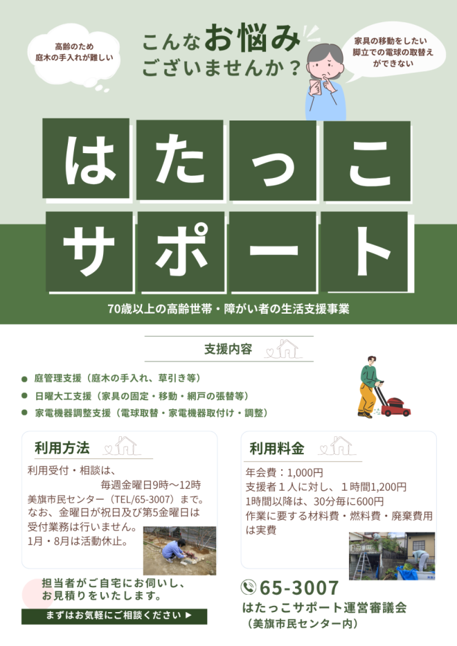 ご高齢世帯などの支援事業「はたっこサポート」を再開します。