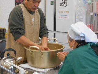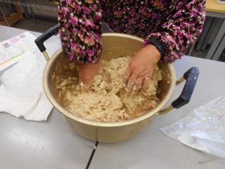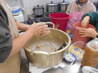 当日は、リピーターの方も多く事前にお渡ししていたレシピとお世話人さんの指導を受けながら作業を進められました。まずは豆を柔らかく煮てることが大事で、柔らかく煮てきたつもりでもまだ硬かった方は再度煮てもらいました。今回ご夫婦での参加もあり煮た豆をつぶす作業は男性の力強さがすごく助かりました。仕込みが終わった方はまだ作業中の方をフォロー、またできる片付けを進めていただいたりと、助け合いながら今年度の味噌づくりも無事に仕込みが終わりました。仕込み終了後はお世話人さん主催でのお茶会をして皆さん仕込んだ味噌を持って笑顔で帰られました。